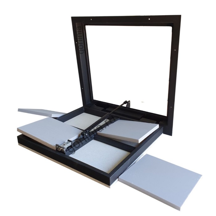 Конструкция смещенного за ось шарнирного соединения убирает сквозняк из подвала, сохраняя проем лаза в чистоте 1050х800.